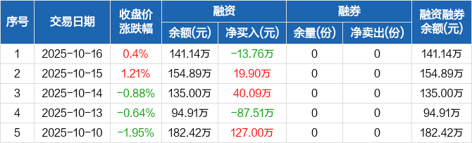 融資方面,當(dāng)日融資買(mǎi)入85.32萬(wàn)元,融資償還99.08萬(wàn)元,融資凈償還13.76萬(wàn)元。融券方面,融券賣(mài)出0份,融券償還0份,融券余量0份,融券余額0元。融資融券余額合計(jì)141.14萬(wàn)元。