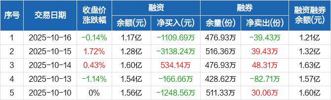 融資方面,當(dāng)日融資買入882.98萬元,融資償還1992.67萬元,融資凈償還1109.69萬元。融券方面,融券賣出0份,融券償還39.43萬份,融券余量476.93萬份,融券余額338.62萬元。融資融券余額合計(jì)1.21億元。