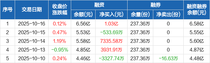 融資方面,當(dāng)日融資買入1.85億元,融資償還8211.45萬元,融資凈買入1.03億元。融券方面,融券賣出0份,融券償還0份,融券余量237.36萬份,融券余額202.47萬元。融資融券余額合計(jì)6.58億元。