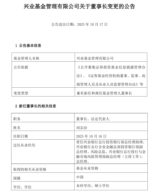 10月17日,興業(yè)基金發(fā)布董事長變更公告。公告顯示,公司任命劉宗治為新董事長,原董事長葉文煌因年齡原因離任,任職日期和離任日期均為2025年10月16日。