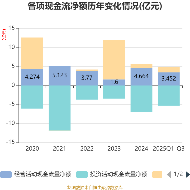 2025年前三季度,公司經(jīng)營(yíng)活動(dòng)現(xiàn)金流凈額為3.45億元,同比增長(zhǎng)27.02%;籌資活動(dòng)現(xiàn)金流凈額1.36億元,同比減少2398.83萬(wàn)元;投資活動(dòng)現(xiàn)金流凈額-5.31億元,上年同期為-7.4億元。