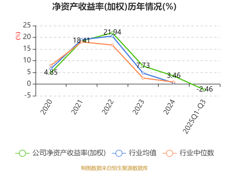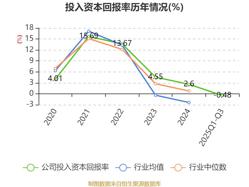 盈利能力方面, 2025年前三季度公司加權(quán)平均凈資產(chǎn)收益率為-2.46%,同比下降3.81個百分點。公司2025年前三季度投入資本回報率為-0.48%,較上年同期下降1.68個百分點。