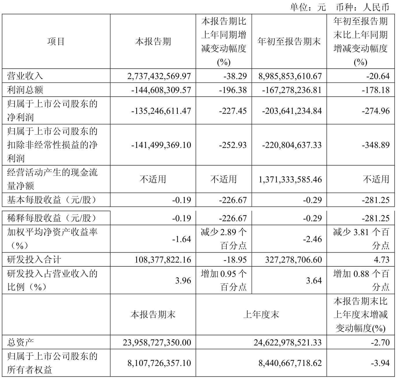 中證智能財訊容百科技(688005)10月18日披露2025年第三季度報告。前三季度公司實現(xiàn)營業(yè)總收入89.86億元,同比下降20.64%;歸母凈利潤虧損2.04億元,上年同期盈利1.16億元;扣非凈利潤虧損2.21億元,上年同期盈利8871.51萬元;經(jīng)營活動產(chǎn)生的現(xiàn)金流量凈額為13.71億元,上年同期為-4.85億元;報告期內(nèi),容百科技基本每股收益為-0.29元,加權(quán)平均凈資產(chǎn)收益率為-2.46%。