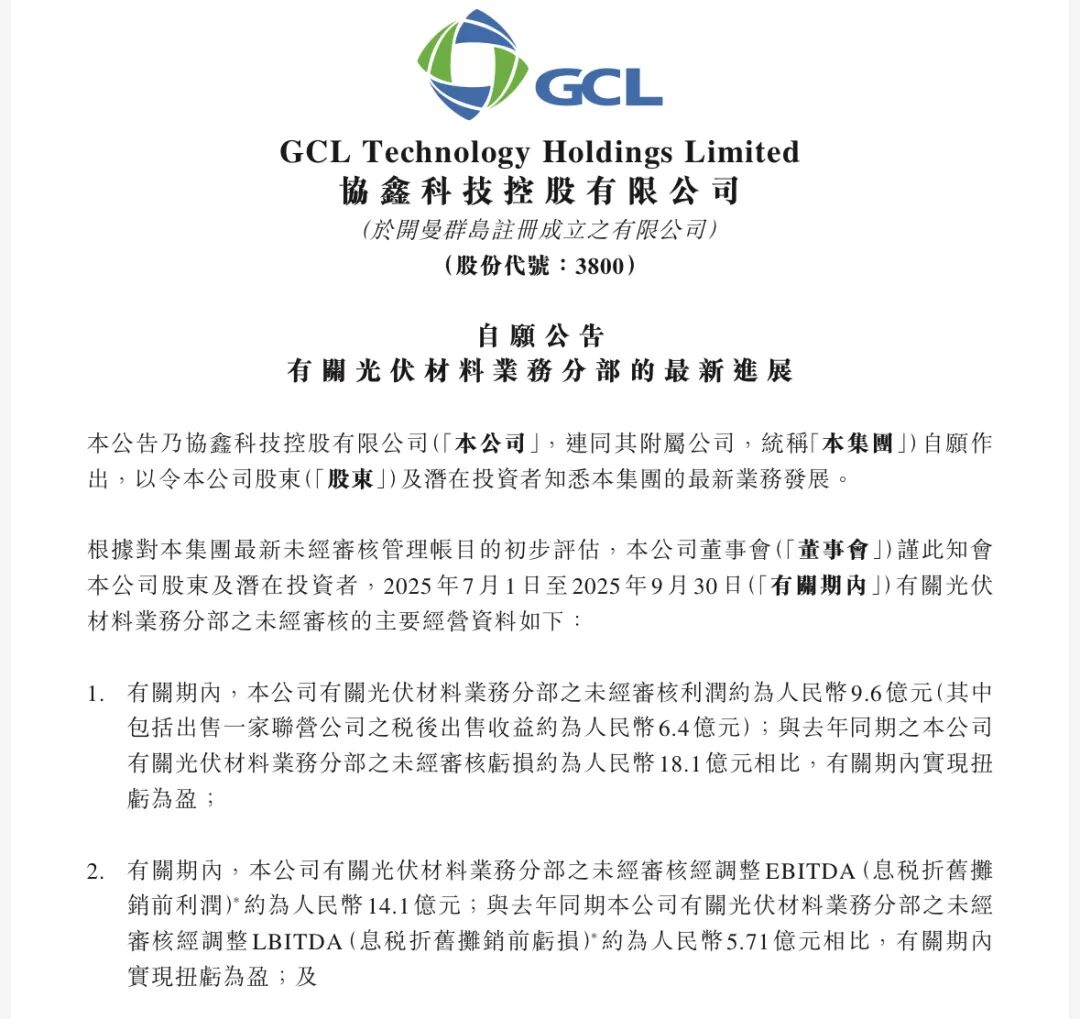 10月16日,協(xié)鑫科技(03800.HK)發(fā)布自愿公告,披露三季度光伏材料業(yè)績情況。
