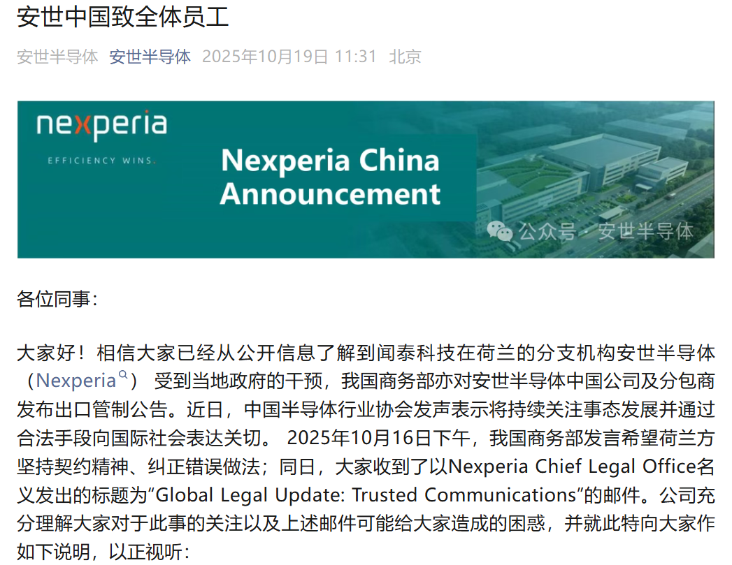 10月19日,安世半導(dǎo)體中國官微發(fā)布《安世中國致全體員工》的公開信,對近期情況進(jìn)行說明。