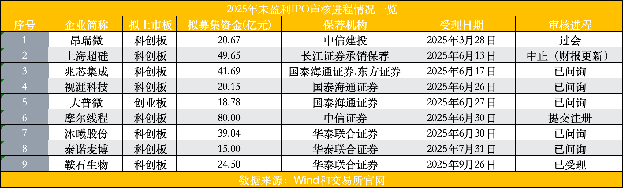 根據(jù)上交所相關規(guī)定,上市時未盈利,指公司上市前一個會計年度經(jīng)審計扣除非經(jīng)常性損益前后凈利潤孰低者為負。Wind數(shù)據(jù)顯示,2025年以來,已有9家未盈利性IPO獲得受理,其中僅大普微是申報創(chuàng)業(yè)板,由國泰海通證券保薦。
