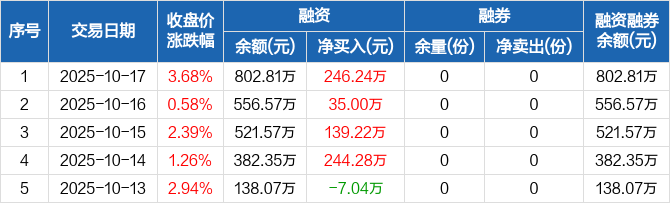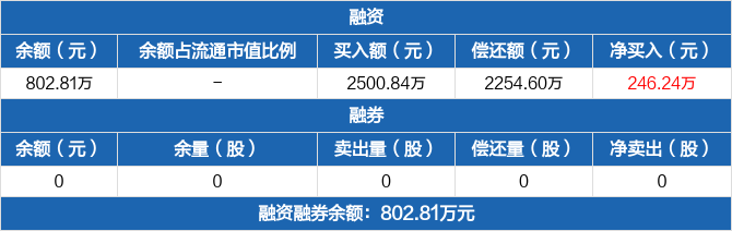 融資方面,當(dāng)日融資買入2500.84萬元,融資償還2254.6萬元,融資凈買入246.24萬元,連續(xù)4日凈買入累計(jì)664.74萬元。融券方面,融券賣出0份,融券償還0份,融券余量0份,融券余額0元。融資融券余額合計(jì)802.81萬元。