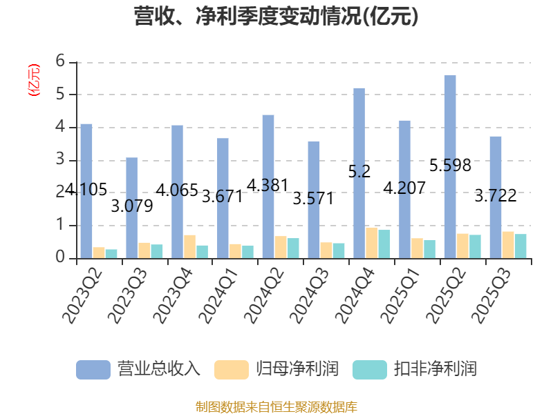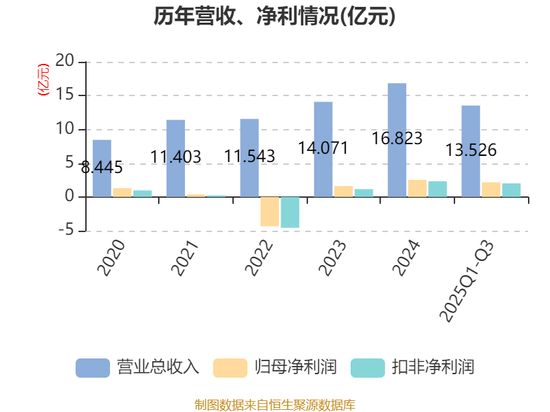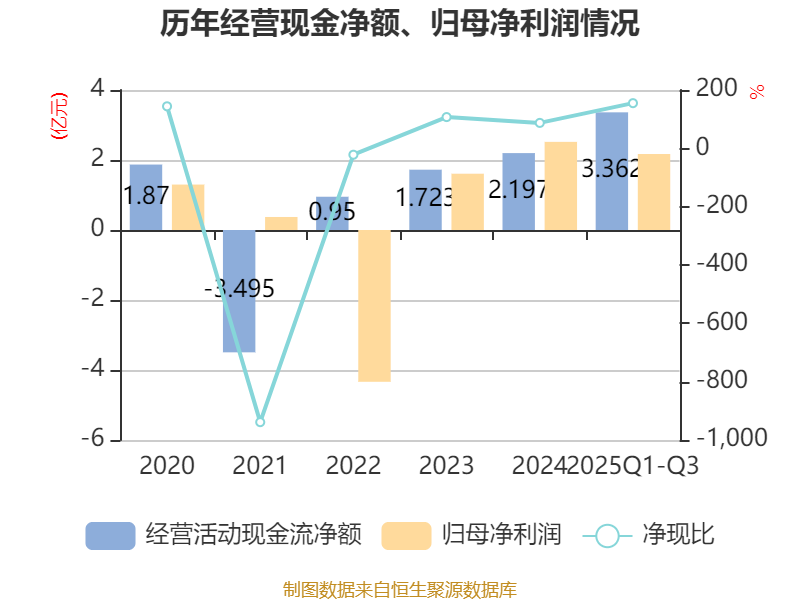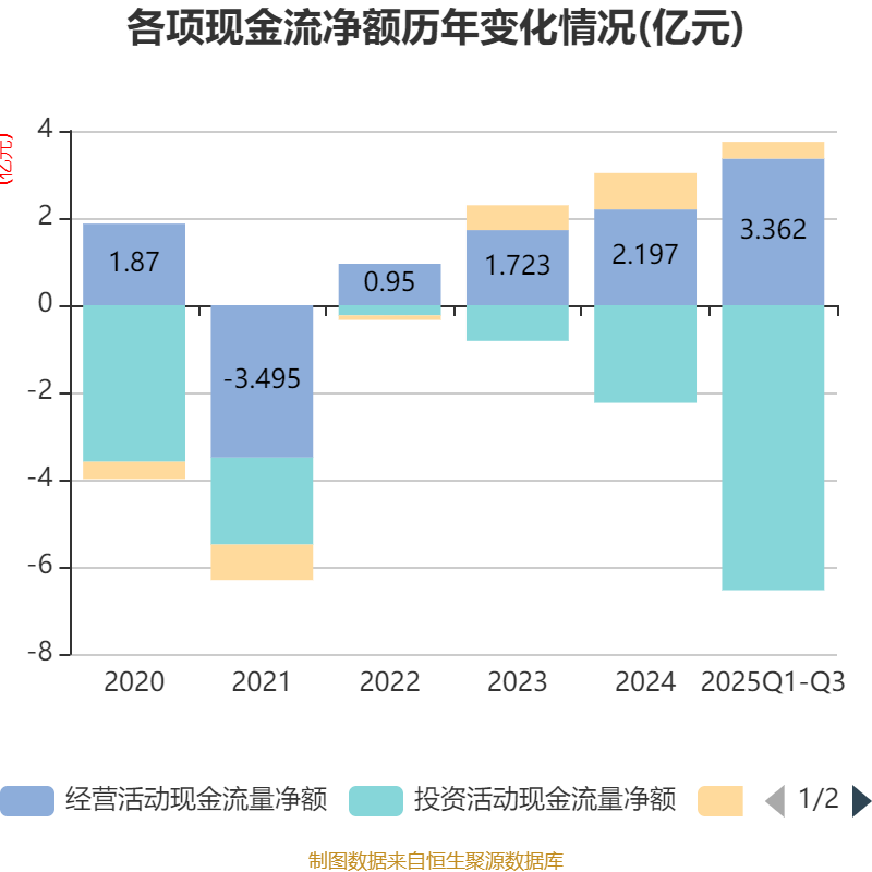 2025年前三季度,公司經(jīng)營活動現(xiàn)金流凈額為3.36億元,同比增長2695.95%;籌資活動現(xiàn)金流凈額3845.24萬元,同比減少2459.81萬元;投資活動現(xiàn)金流凈額-6.54億元,上年同期為-3.66億元。