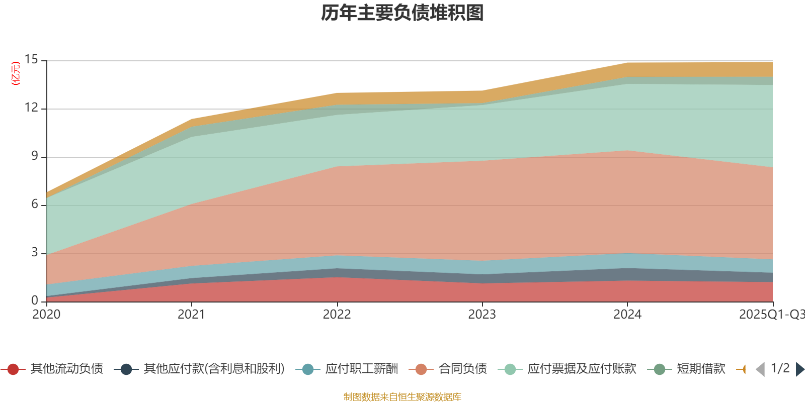 負債重大變化方面,截至2025年三季度末,公司合同負債較上年末減少10.31%,占公司總資產(chǎn)比重下降2.66個百分點;應付票據(jù)及應付賬款較上年末增加23.81%,占公司總資產(chǎn)比重上升1.92個百分點;其他應付款(含利息和股利)較上年末減少25.08%,占公司總資產(chǎn)比重下降0.63個百分點;其他流動負債較上年末減少6.97%,占公司總資產(chǎn)比重下降0.43個百分點。