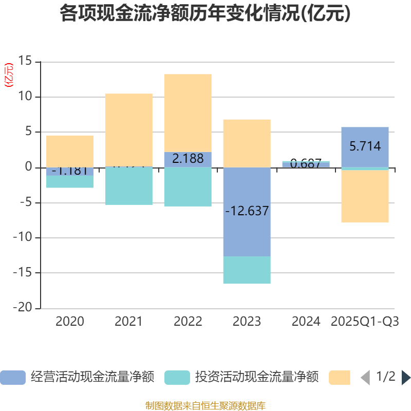 2025年前三季度,公司經營活動現(xiàn)金流凈額為5.71億元,同比增長121.17%;籌資活動現(xiàn)金流凈額-7.39億元,同比減少9.19億元;投資活動現(xiàn)金流凈額-4255.28萬元,上年同期為-8570.79萬元。