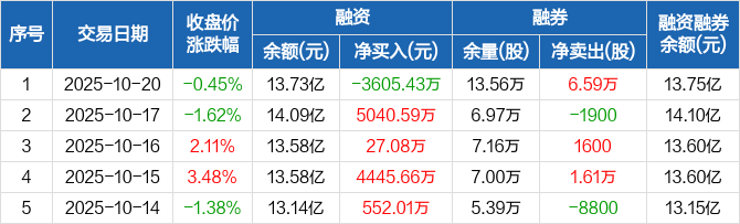 融資方面,當(dāng)日融資買入1.67億元,融資償還2.03億元,融資凈償還3605.43萬元。融券方面,融券賣出7.09萬股,融券償還5000股,融券余量13.56萬股,融券余額269.98萬元。融資融券余額合計(jì)13.75億元。