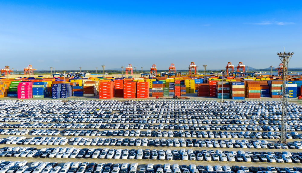 8月8日,新能源汽車在江蘇南京龍?zhí)陡奂b箱碼頭等候運(yùn)輸(無人機(jī)照片)。新華社發(fā)(楊素平攝)