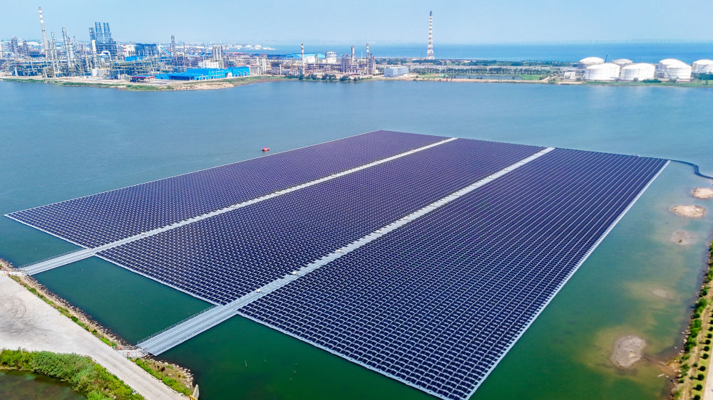 7月4日拍攝的中國石化青島煉化全海水環(huán)境漂浮式光伏項(xiàng)目現(xiàn)場(chǎng)(無人機(jī)照片)。新華社發(fā)(張進(jìn)剛攝)