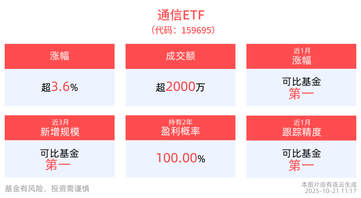 截至10月20日,通信ETF近2年凈值上漲94.23%,指數(shù)股票型基金排名39/2358,居于前1.65%。從收益能力看,截至2025年10月20日,通信ETF自成立以來,最高單月回報(bào)為33.97%,最長連漲月數(shù)為5個(gè)月,最長連漲漲幅為76.35%,上漲月份平均收益率為7.57%。