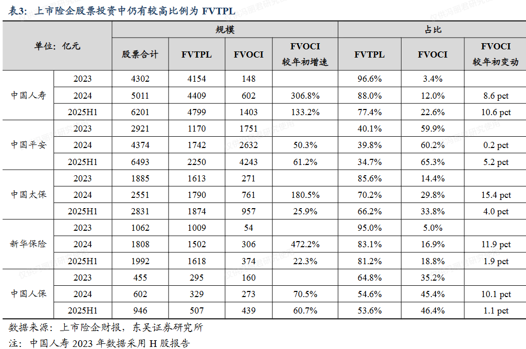 根據(jù)東吳證券數(shù)據(jù),2025上半年五家A股上市險(xiǎn)企股票歸入FVTPL的占比中,新華保險(xiǎn)(81.2%)、中國人壽(77.4%)最高,中國太保(66.2%)、中國人保(53.6%)均超過五成,中國平安(34.7%)不到四成。