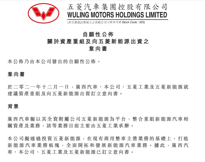 2021年12月1日,五菱汽車(HK.00305)發(fā)布《關(guān)于資產(chǎn)重組及向五菱新能源出資之意向書》稱,公司與廣西汽車、五菱工業(yè)(即柳州五菱汽車工業(yè)有限公司)及五菱新能源就建議資產(chǎn)重組及向五菱新能源出資訂立意向書,旨在以五菱新能源為平臺(tái),整合集團(tuán)全部資源,聚焦新能源汽車領(lǐng)域。