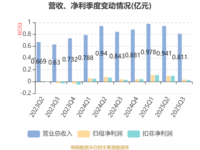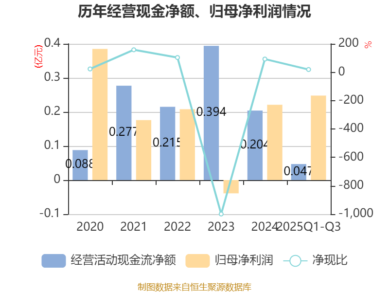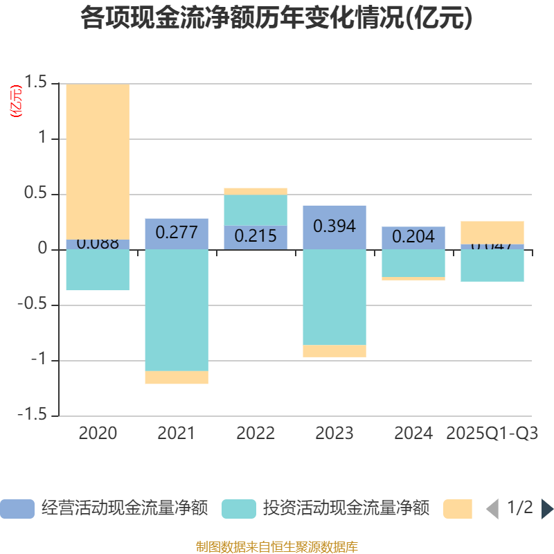 2025年前三季度,公司經(jīng)營活動現(xiàn)金流凈額為467.04萬元,同比下降45.38%;籌資活動現(xiàn)金流凈額2059.44萬元,同比增加2363.32萬元;投資活動現(xiàn)金流凈額-2923.12萬元,上年同期為-1927.39萬元。