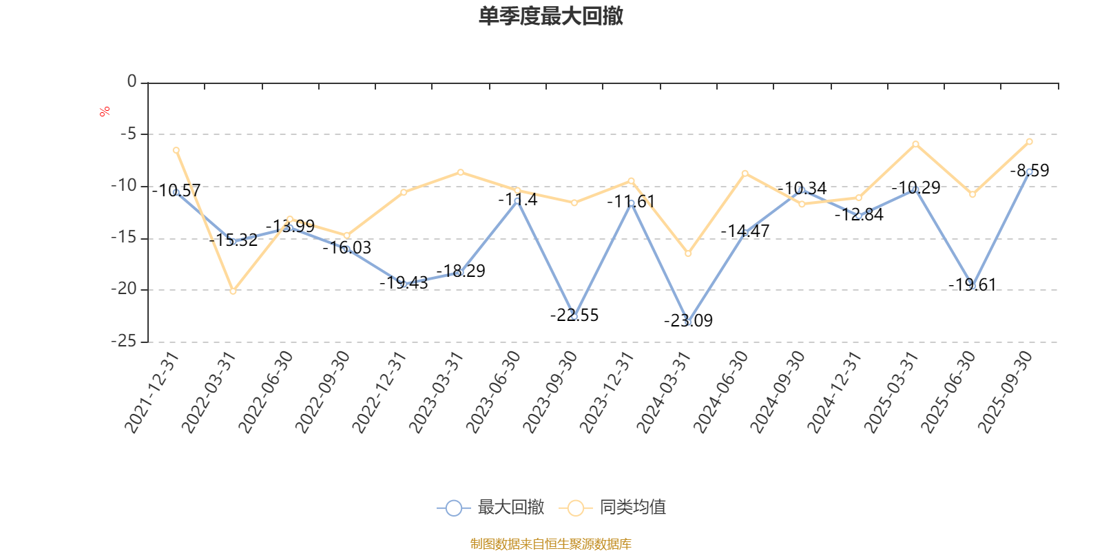 截至10月24日,基金近三年最大回撤為57.24%,同類可比基金排名507/519。單季度最大回撤出現(xiàn)在2024年一季度,為23.09%。