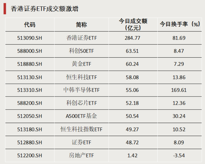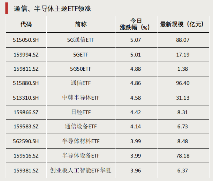 ETF方面,部分5G通信主題ETF漲超5%,芯片設(shè)備ETF(560780)、通信ETF廣發(fā)(159507)、信息技術(shù)ETF(159939)等漲超3%,聚焦硬科技資產(chǎn)的港股通科技ETF(159262)、芯片ETF龍頭(159801)漲幅均超2%。
