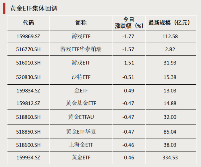 游戲、地產(chǎn)、消費(fèi)等板塊今日整體表現(xiàn)趨弱,3只游戲主題ETF均跌超1.5%。此外,在國際金價(jià)持續(xù)調(diào)整下,黃金ETF、上海金ETF今日收跌。