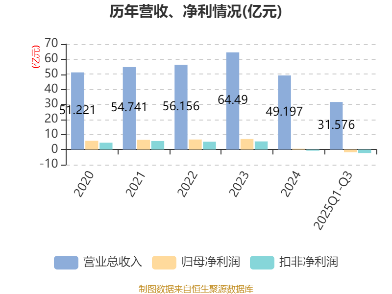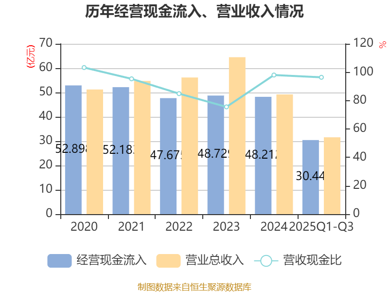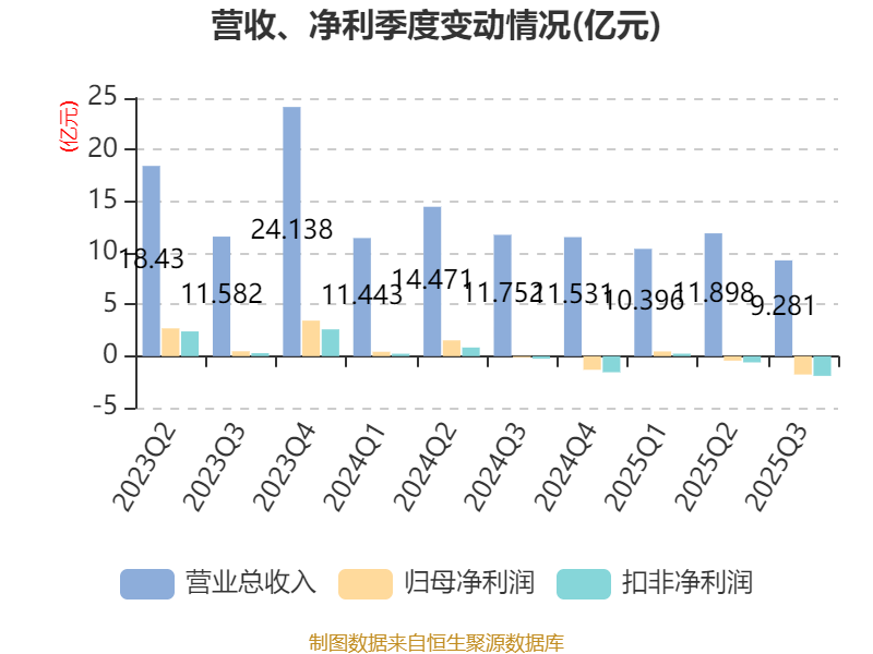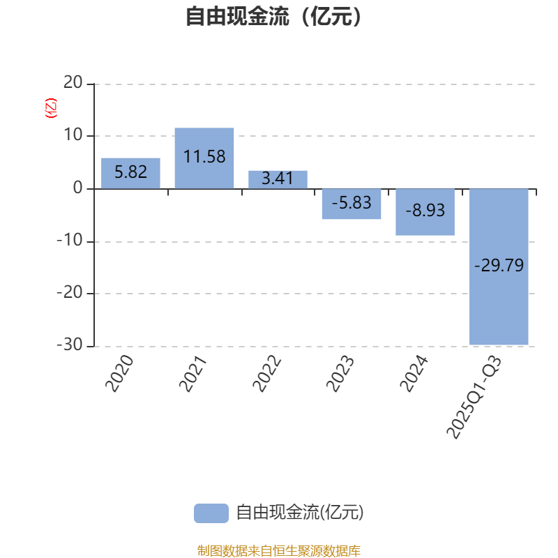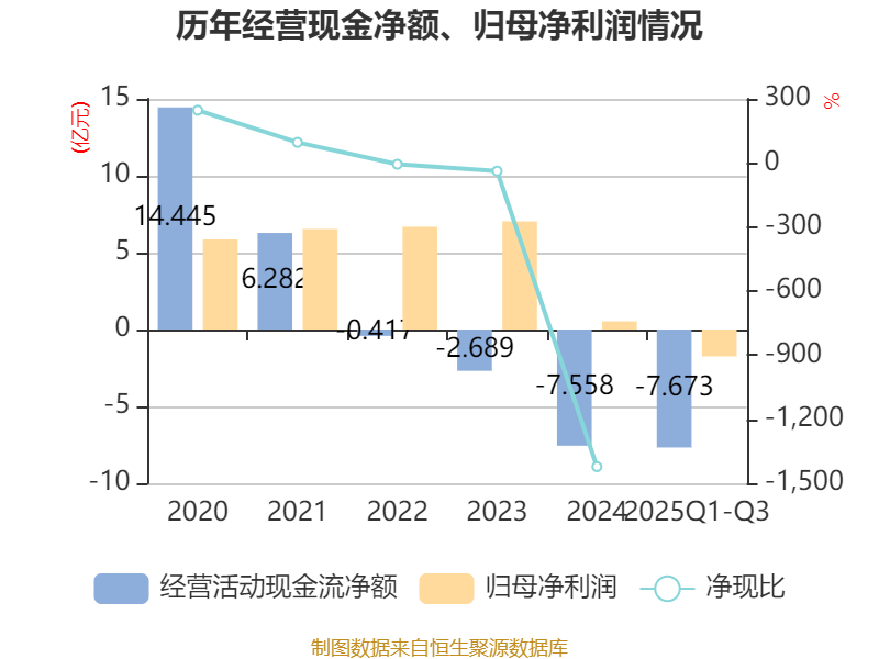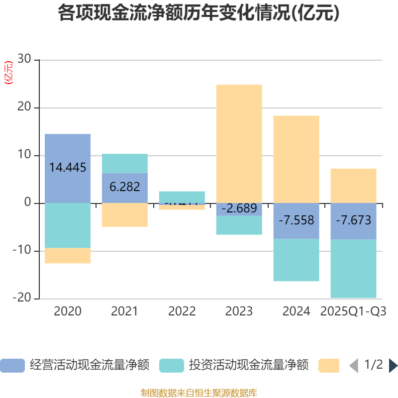 2025年前三季度,公司經(jīng)營活動現(xiàn)金流凈額為-7.67億元,同比增加2.79億元;籌資活動現(xiàn)金流凈額7.19億元,同比減少12.58億元;投資活動現(xiàn)金流凈額-12.21億元,上年同期為-11.22億元。