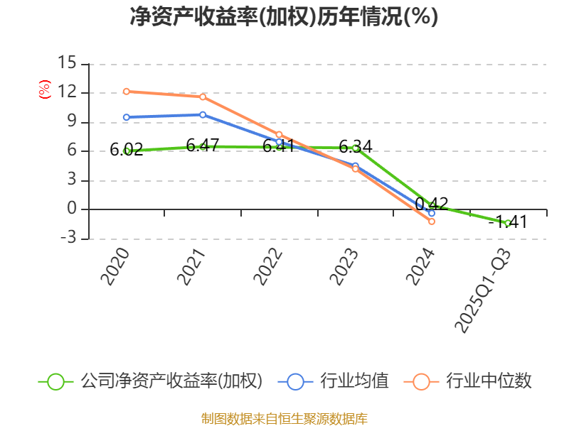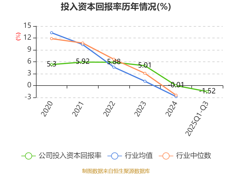 盈利能力方面, 2025年前三季度公司加權平均凈資產(chǎn)收益率為-1.41%,同比下降2.86個百分點。公司2025年前三季度投入資本回報率為-1.52%,較上年同期下降2.41個百分點。