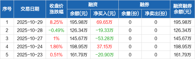 融資方面,當(dāng)日融資買(mǎi)入255.3萬(wàn)元,融資償還185.65萬(wàn)元,融資凈買(mǎi)入69.65萬(wàn)元。融券方面,融券賣(mài)出0份,融券償還0份,融券余量0份,融券余額0元。融資融券余額合計(jì)195.98萬(wàn)元。
