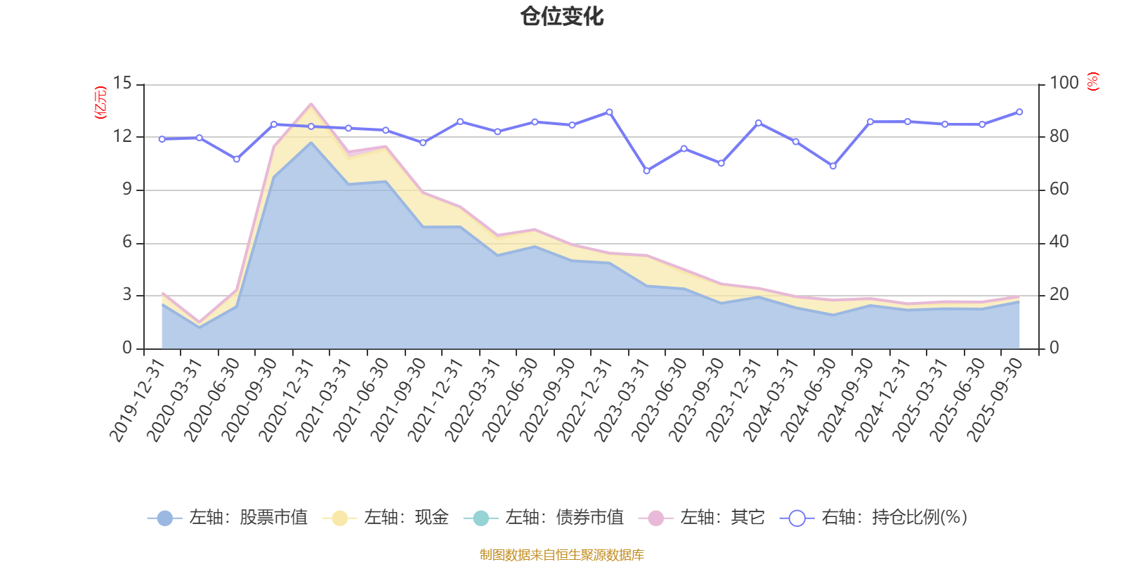 據(jù)定期報(bào)告數(shù)據(jù)統(tǒng)計(jì),近三年平均股票倉位為80.55%,同類平均為85.66%。2025年三季度末基金達(dá)到89.57%的最高倉位,2023年一季度末最低,為67.31%。