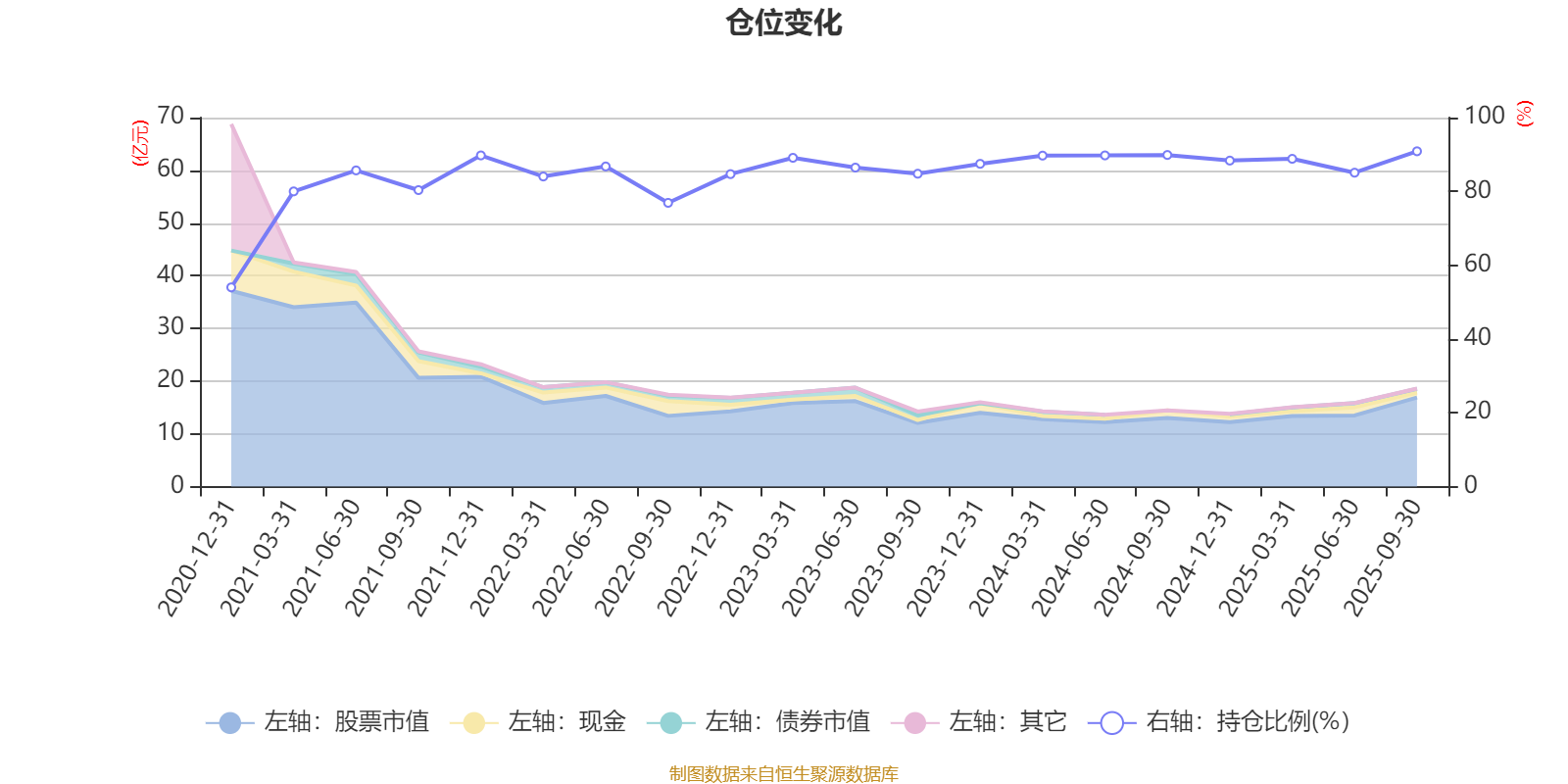據(jù)定期報(bào)告數(shù)據(jù)統(tǒng)計(jì),近三年平均股票倉位為87.91%,同類平均為87.62%。2025年三季度末基金達(dá)到90.87%的最高倉位,2020年末最低,為53.99%。