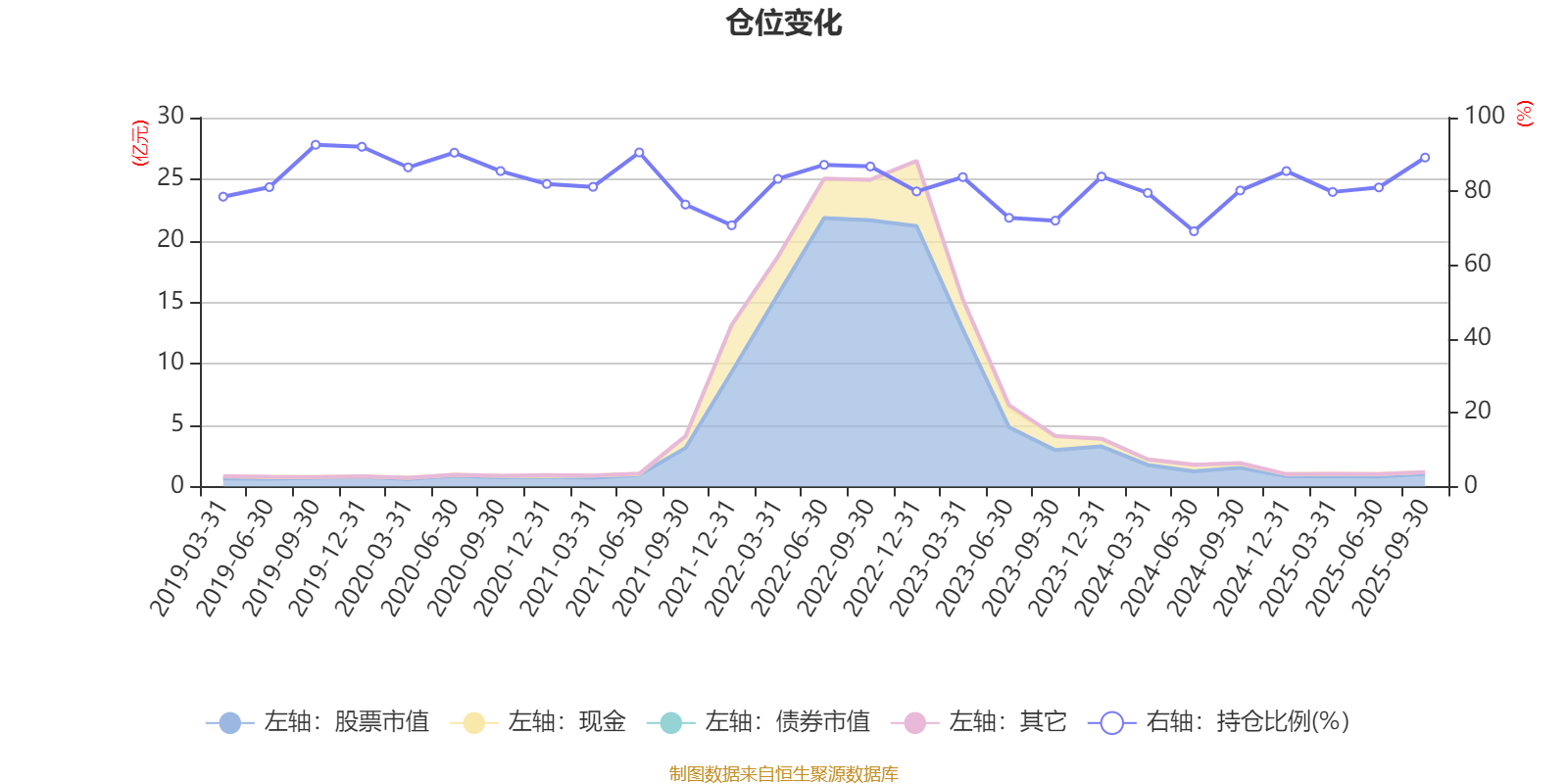 據(jù)定期報告數(shù)據(jù)統(tǒng)計,近三年平均股票倉位為79.78%,同類平均為83.73%。2019年三季度末基金達到92.64%的最高倉位,2024年上半年末最低,為69.19%。