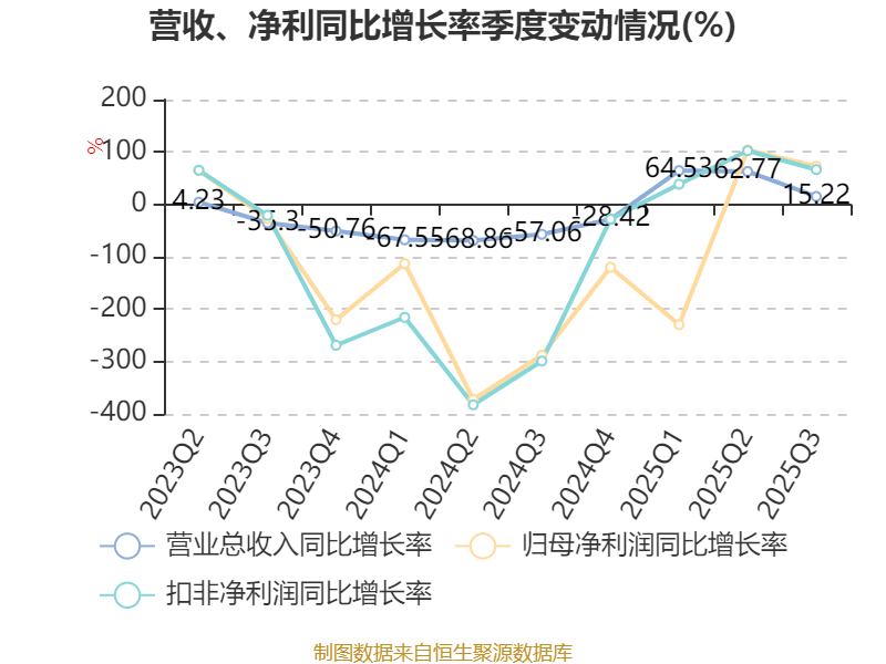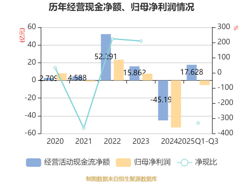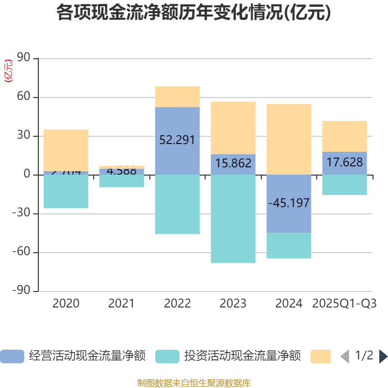 2025年前三季度,公司經(jīng)營(yíng)活動(dòng)現(xiàn)金流凈額為17.63億元,同比增加62.04億元;籌資活動(dòng)現(xiàn)金流凈額23.88億元,同比減少34.9億元;投資活動(dòng)現(xiàn)金流凈額-15.72億元,上年同期為-14.87億元。