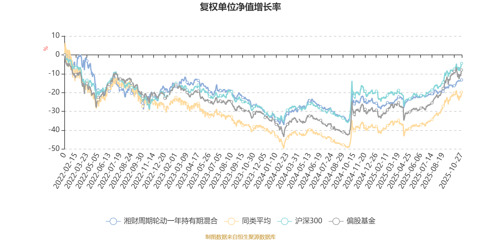 截至10月27日,湘財周期輪動一年持有期混合近三個月復權(quán)單位凈值增長率為6.95%,位于同類可比基金498/621;近半年復權(quán)單位凈值增長率為13.34%,位于同類可比基金537/619;近一年復權(quán)單位凈值增長率為15.49%,位于同類可比基金488/611;近三年復權(quán)單位凈值增長率為11.26%,位于同類可比基金301/518。