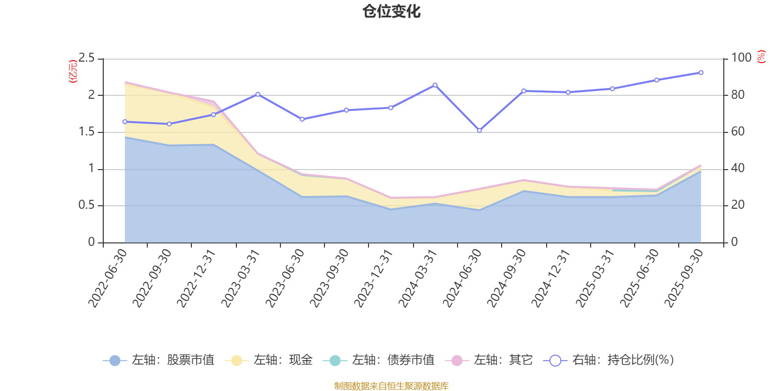 據(jù)定期報(bào)告數(shù)據(jù)統(tǒng)計(jì),近三年平均股票倉位為78.15%,同類平均為83.73%。2025年三季度末基金達(dá)到92.42%的最高倉位,2024年上半年末最低,為60.99%。
