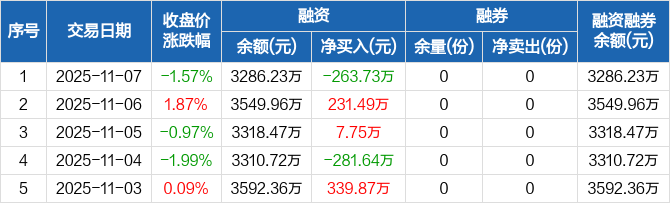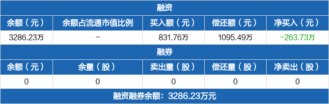 融資方面,當(dāng)日融資買入831.76萬元,融資償還1095.49萬元,融資凈償還263.73萬元。融券方面,融券賣出0份,融券償還0份,融券余量0份,融券余額0元。融資融券余額合計3286.23萬元。