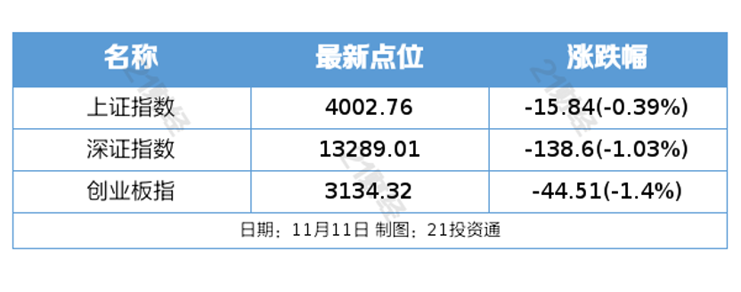 11月11日,市場全天震蕩調(diào)整,三大指數(shù)高開低走。截至收盤,滬指跌0.39%,深成指跌1.03%,創(chuàng)業(yè)板指跌1.4%。滬深兩市成交額不到2萬億元,較上一個(gè)交易日縮量1809億元。
