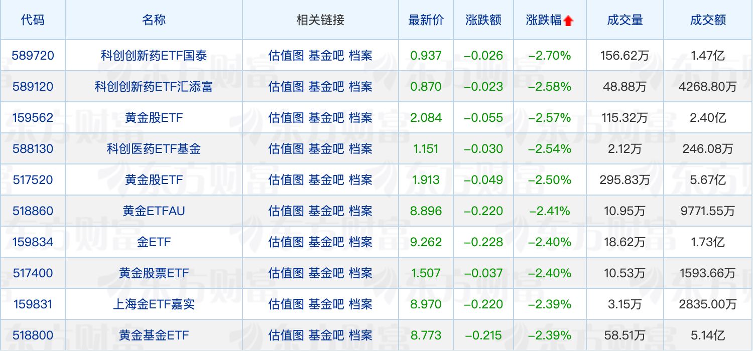 下跌方面,醫(yī)藥概念集體下挫,舒泰神、濟民健康等大跌。科創(chuàng)創(chuàng)新藥ETF國泰領跌2.70%,多只黃金相關ETF回調居前。