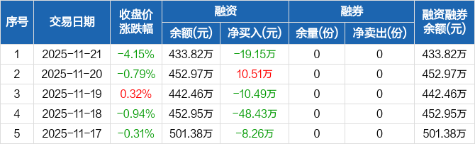 融資方面,當(dāng)日融資買入148.89萬元,融資償還168.04萬元,融資凈償還19.15萬元。融券方面,融券賣出0份,融券償還0份,融券余量0份,融券余額0元。融資融券余額合計(jì)433.82萬元。