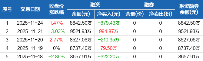 融資方面,當日融資買入2067.04萬元,融資償還2746.47萬元,融資凈償還679.43萬元。融券方面,融券賣出0份,融券償還0份,融券余量0份,融券余額0元。融資融券余額合計8842.5萬元。