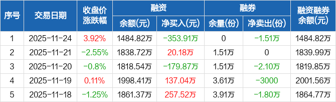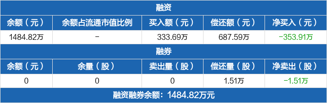 融資方面,當(dāng)日融資買入333.69萬(wàn)元,融資償還687.59萬(wàn)元,融資凈償還353.91萬(wàn)元。融券方面,融券賣出0份,融券償還1.51萬(wàn)份,融券余量0份,融券余額0元。融資融券余額合計(jì)1484.82萬(wàn)元。
