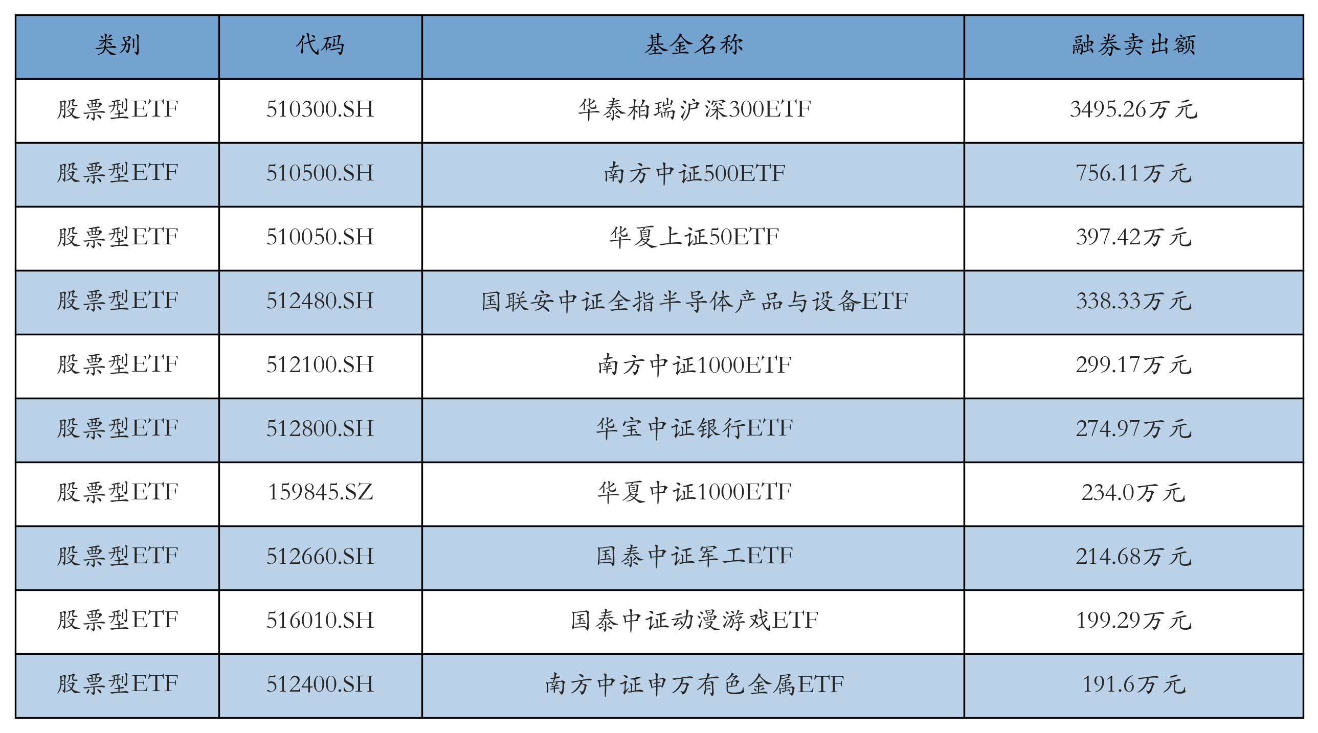 昨日股票型ETF融資賣出額最高的3只ETF及其賣出金額分別為:華泰柏瑞滬深300ETF(3495.26萬元)、南方中證500ETF(756.11萬元)、華夏上證50ETF(397.42萬元)。融券賣出額前10詳情見下表: