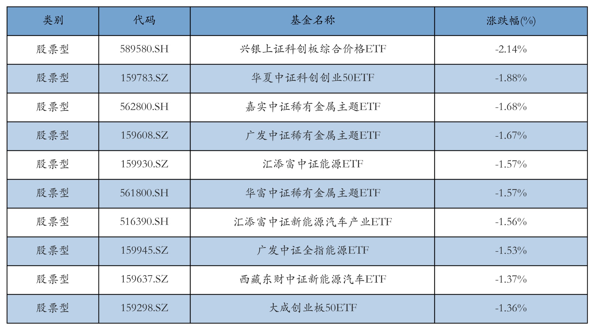 昨日股票型ETF跌幅最大的3只ETF及其收益率分別為:興銀上證科創(chuàng)板綜合價格ETF(-2.14%)、華夏中證科創(chuàng)創(chuàng)業(yè)50ETF(-1.88%)、嘉實中證稀有金屬主題ETF(-1.68%)。跌幅前10詳情見下表: