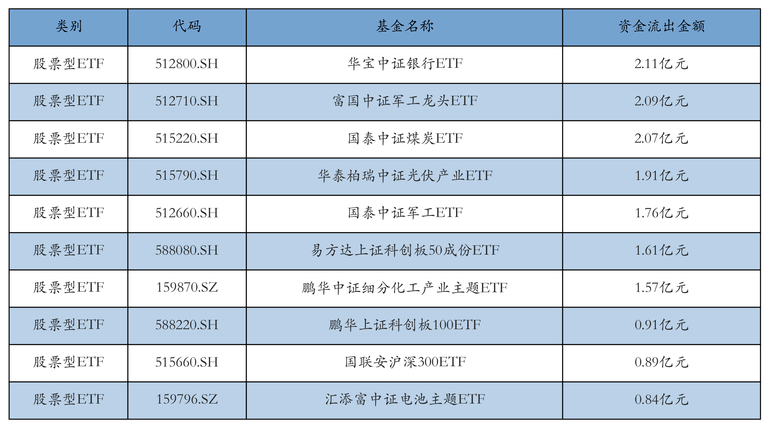 昨日股票型ETF資金流出最多的3只ETF及其流出金額分別為:華寶中證銀行ETF(流出2.11億元)、富國中證軍工龍頭ETF(流出2.09億元)、國泰中證煤炭ETF(流出2.07億元)。資金流出前10詳情見下表: