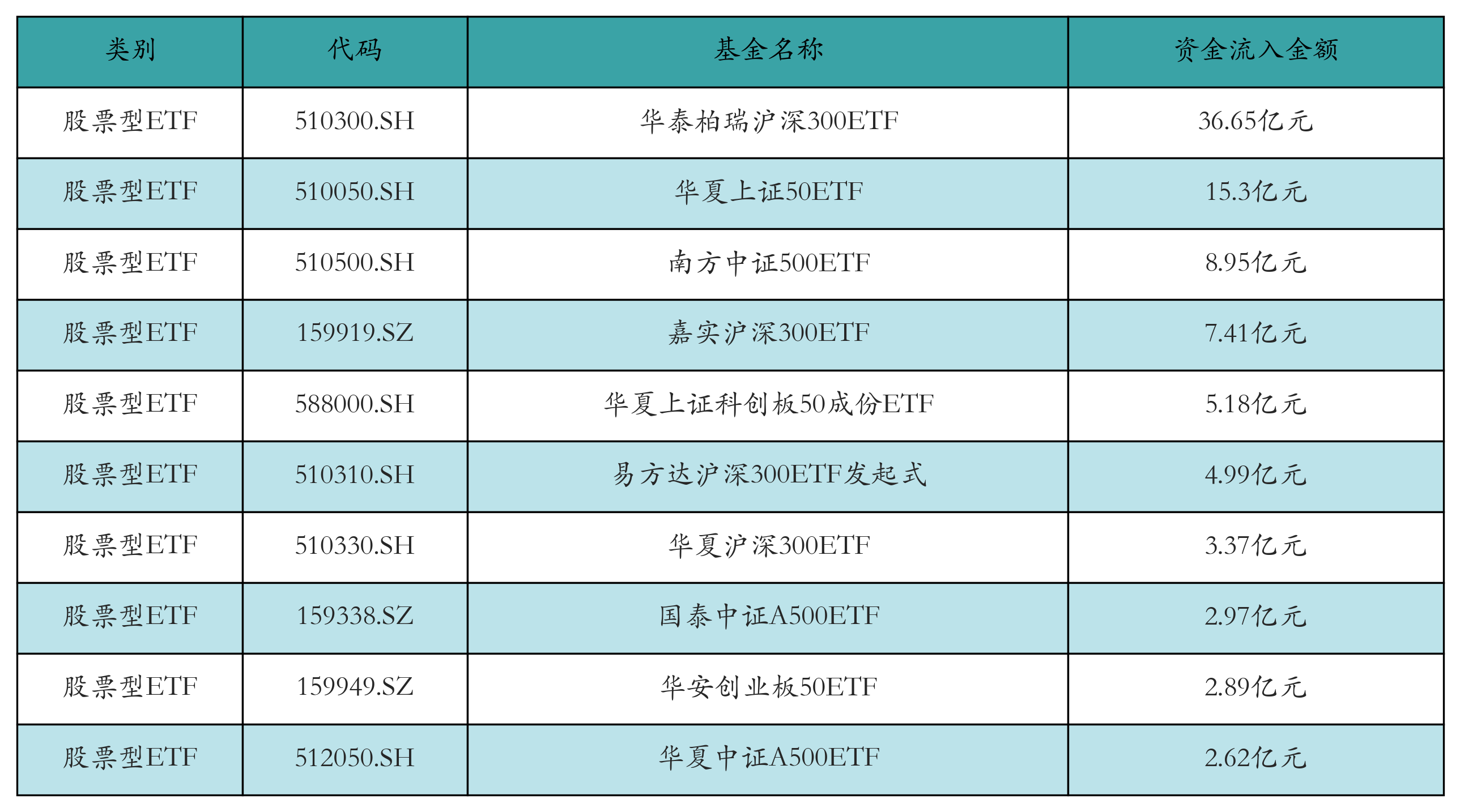 昨日股票型ETF資金流入最多的3只ETF及其流入金額分別為:華泰柏瑞滬深300ETF(流入36.65億元)、華夏上證50ETF(流入15.3億元)、南方中證500ETF(流入8.95億元)。資金流入前10詳情見下表: