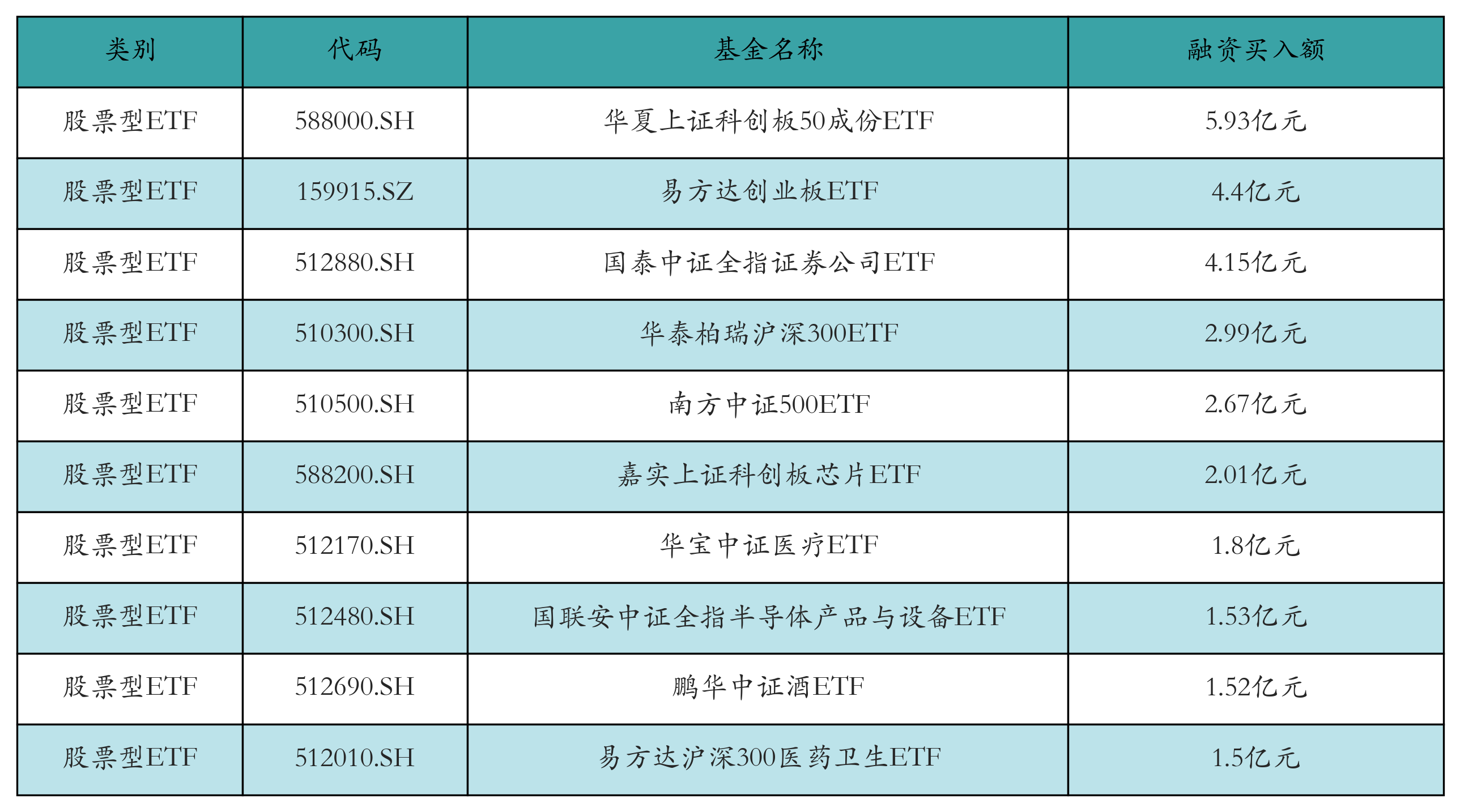 昨日股票型ETF融資買入額最高的3只ETF及其買入金額分別為:華夏上證科創(chuàng)板50成份ETF(5.93億元)、易方達創(chuàng)業(yè)板ETF(4.4億元)、國泰中證全指證券公司ETF(4.15億元)。融資買入額前10詳情見下表: