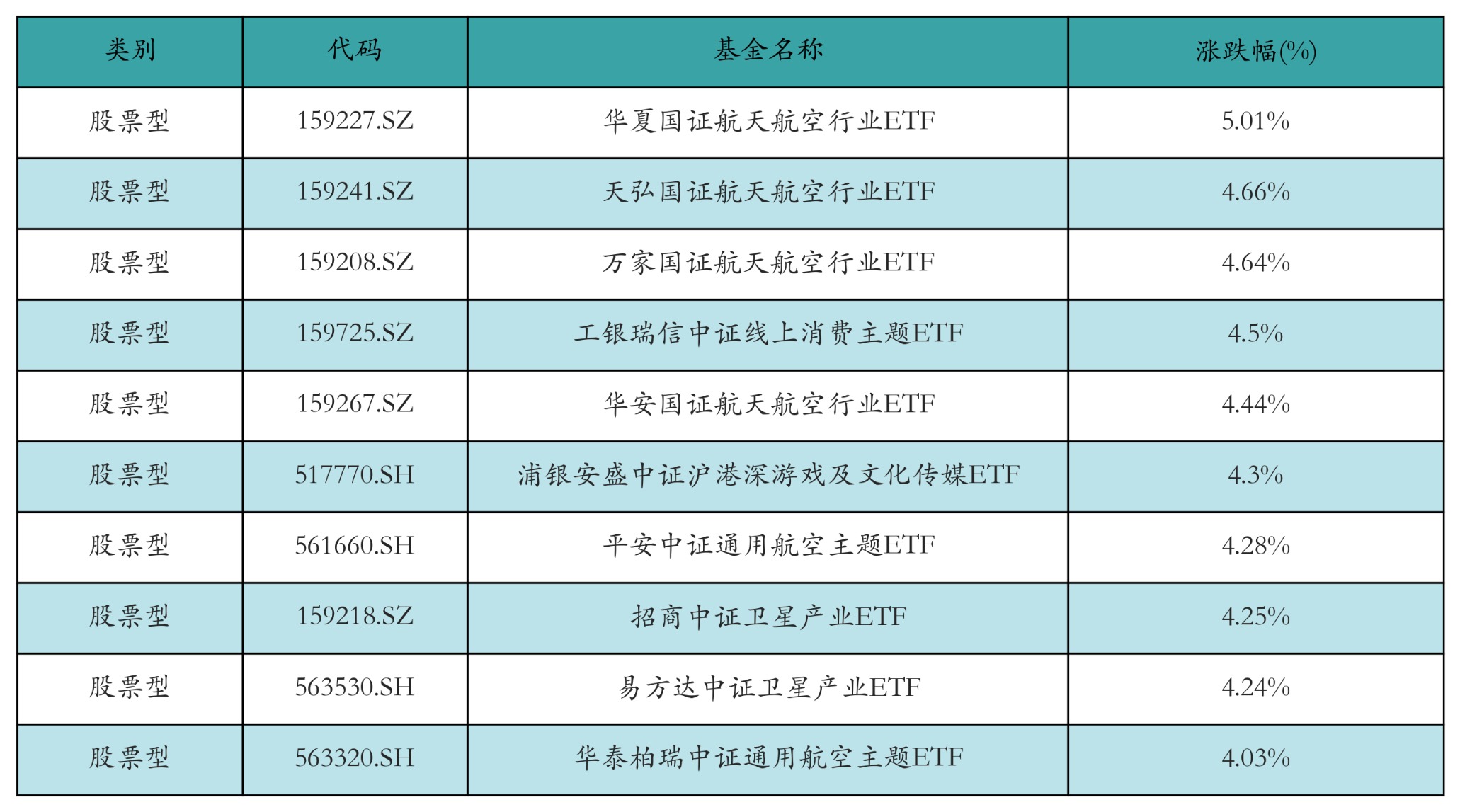 昨日股票型ETF漲幅最高的3只ETF及其收益率分別為:華夏國證航天航空行業(yè)ETF(5.01%)、天弘國證航天航空行業(yè)ETF(4.66%)、萬家國證航天航空行業(yè)ETF(4.64%)。漲幅前10詳情見下表: