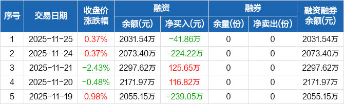 融資方面,當(dāng)日融資買(mǎi)入175.39萬(wàn)元,融資償還217.25萬(wàn)元,融資凈償還41.86萬(wàn)元。融券方面,融券賣(mài)出0份,融券償還0份,融券余量0份,融券余額0元。融資融券余額合計(jì)2031.54萬(wàn)元。