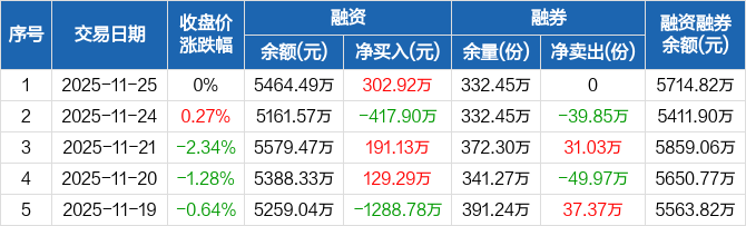 融資方面,當(dāng)日融資買入821.28萬元,融資償還518.36萬元,融資凈買入302.92萬元。融券方面,融券賣出0份,融券償還0份,融券余量332.45萬份,融券余額250.33萬元。融資融券余額合計5714.82萬元。