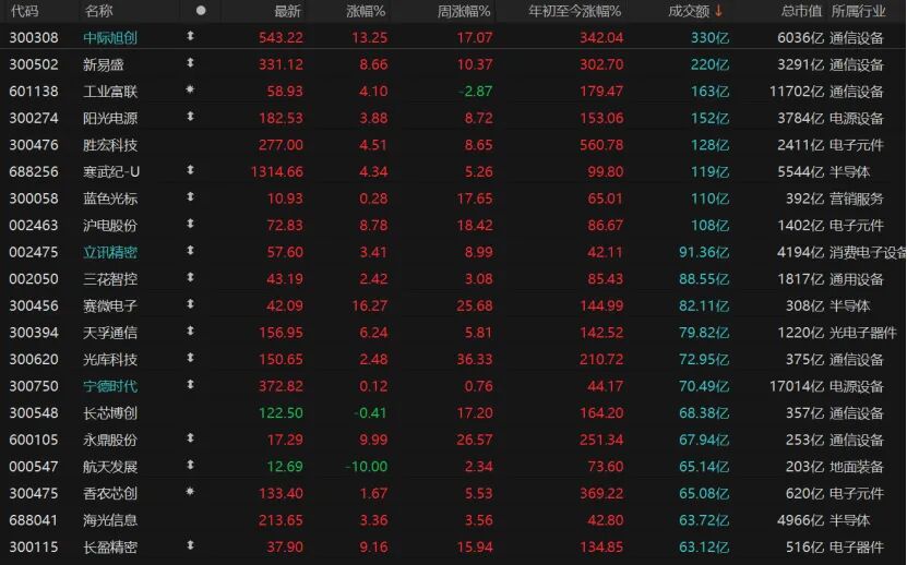 市場虧錢效應(yīng)明顯,共計1692只個股收漲,76只漲停;3593只個股收跌,跌停股6只。市場共8只個股日成交額超過100億元,CPO“易中天”三巨頭(新易盛、中際旭創(chuàng)、天孚通信)聯(lián)袂大漲,成交亦居前;工業(yè)富聯(lián)、勝宏科技、寒武紀(jì)-U漲幅均超過4%,陽光電源漲近4%,寧德時代微紅,但地面裝備個股航天發(fā)展跌停。