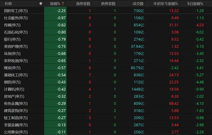 國防軍工板塊以2.25%的跌幅領(lǐng)跌,個股分化顯著:雷科防務(wù)漲停,長城軍工跌超8%。社會服務(wù)、傳媒、石油石化、銀行、美容護(hù)理等板塊均跌約1%。