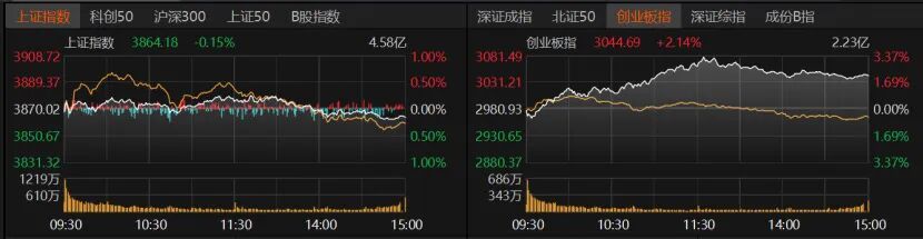 滬深兩市走勢分化。滬指午后走低,最后收跌0.15%報3864.18點;創(chuàng)業(yè)板指午后進(jìn)一步走強(qiáng),收漲2.14%報3044.69點。深證成指漲逾1%??苿?chuàng)50、滬深300、上證50漲幅均不超過1%,北證50收跌。